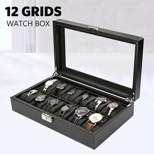 View full detailsProduct Description 12 Sections. Luxury Carbon Fiber Display For watch. There is plenty of space between the lid and cushions to accommodate watc...